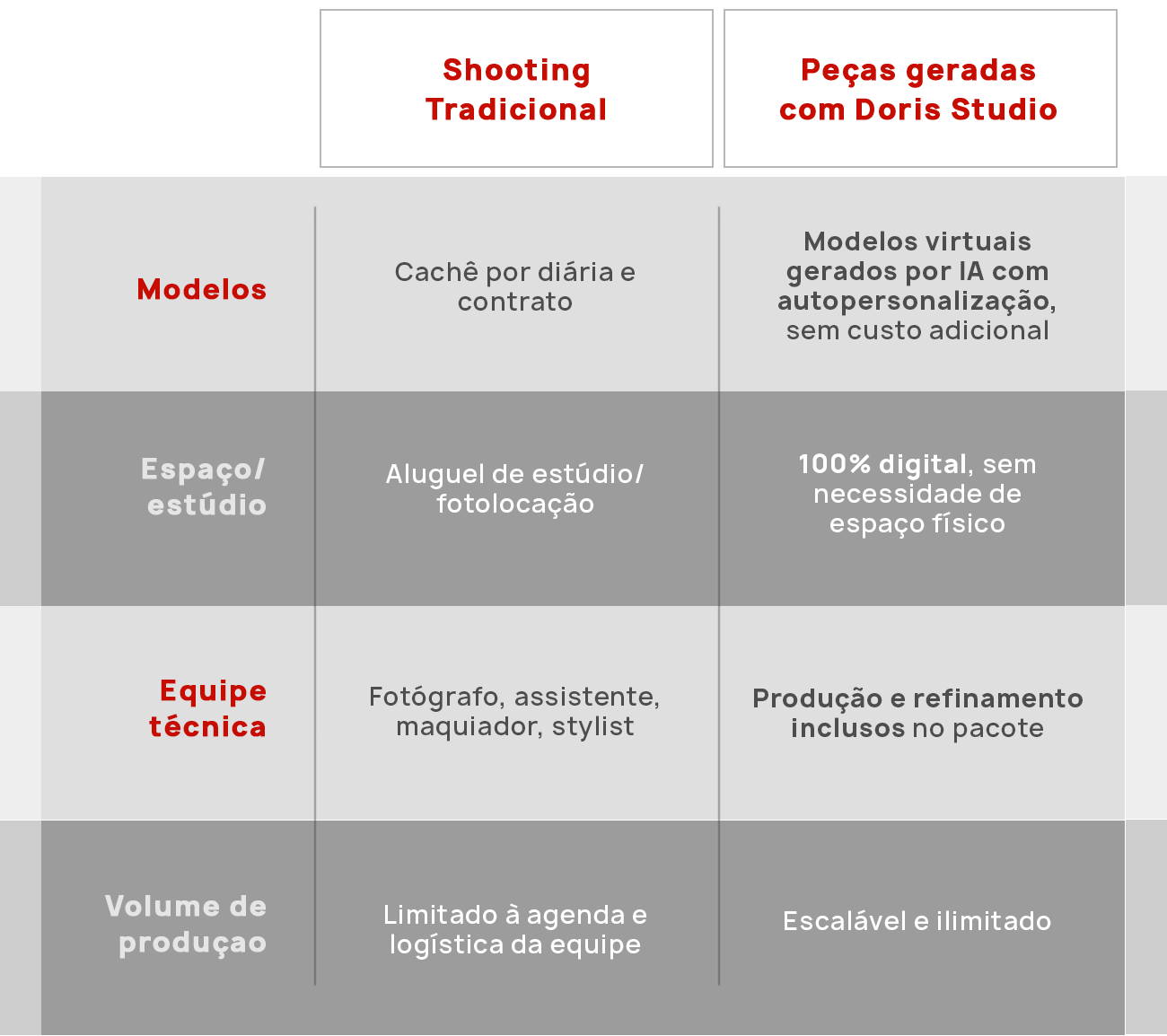 Com o Doris, você elimina a necessidade de locação de estúdios físicos e contratações de fotógrafo, stylists, maquiadores e cabeleireiros.